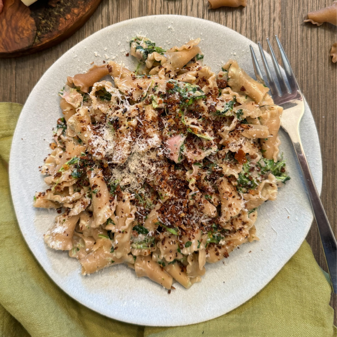 스폴리니의 통곡물 블렌드는 뉴욕 허드슨 밸리의 유기농, 돌로 빻은 단단한 붉은 밀가루를 특징으로 합니다. 단백질 수치가 더 높고 밀기울이 더 진한 단단한 붉은 밀은 뛰어난 풍미, 질감 무결성 및 영양상의 이점을 제공합니다. 풍부하고 튼튼한 밀가루는 꽃이나 뿔처럼 플루트 꽃잎에서 모양을 유지하기 때문에 나팔 모양으로 만들면 환상적입니다.