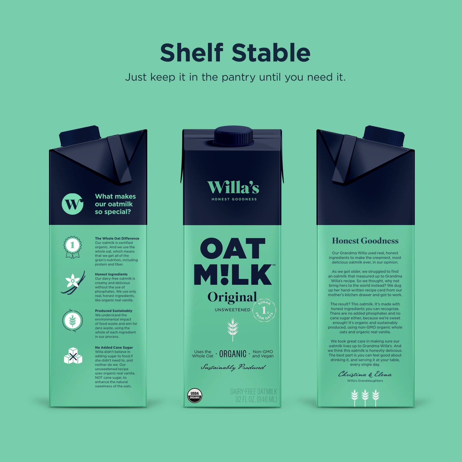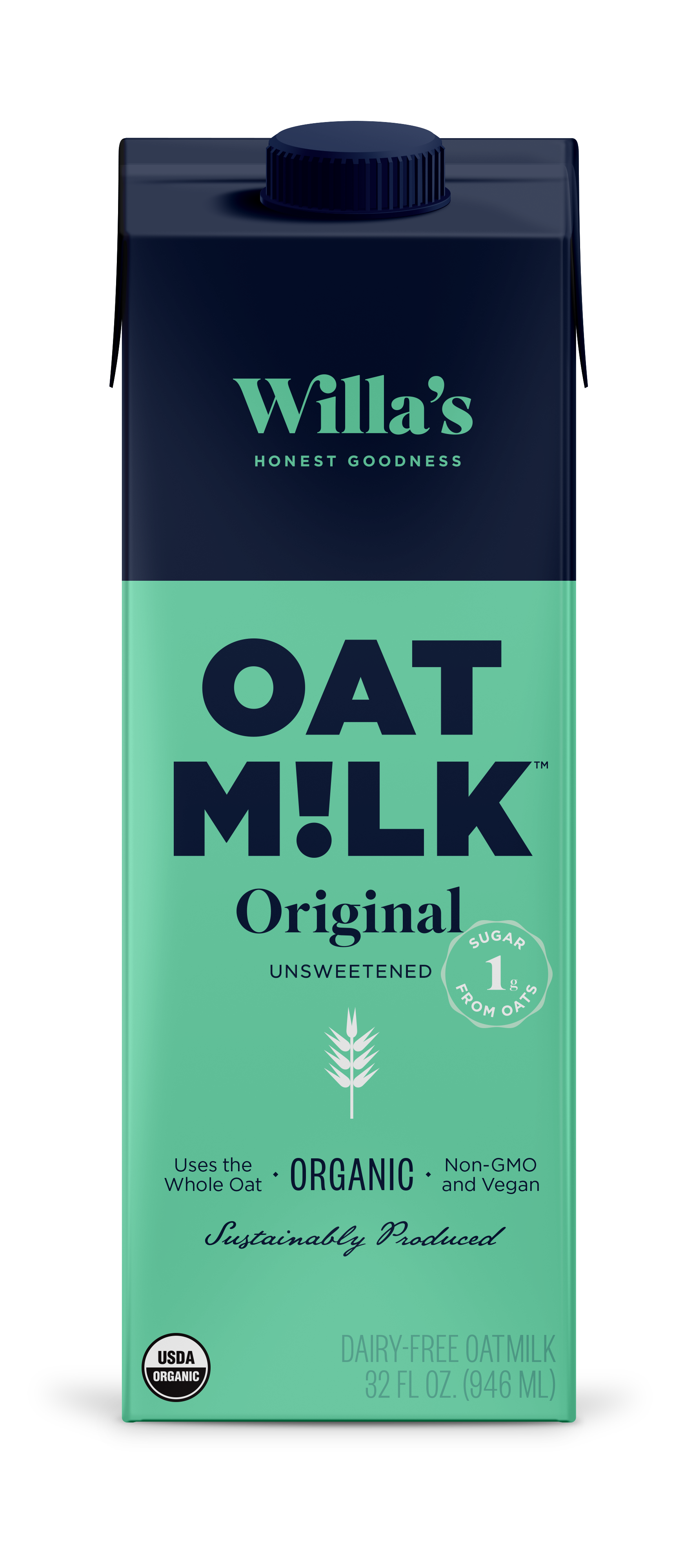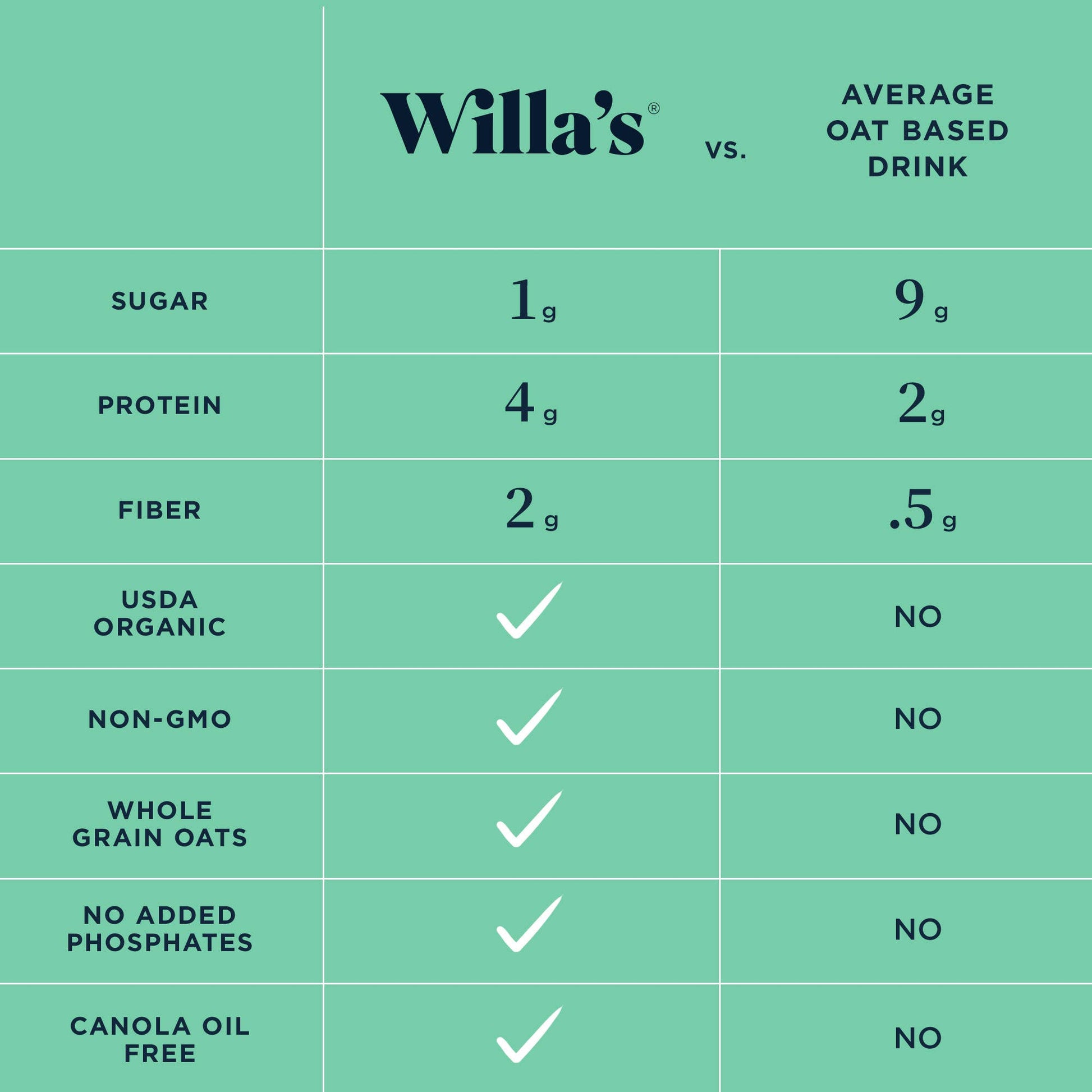 Born from our Grandmother Willa's original recipe, Willa's Unsweetened Original uses just four organic ingredients. And because we use the whole oat, the Unsweetened Original has the most protein and fiber and lowest sugar content of any oat milk.