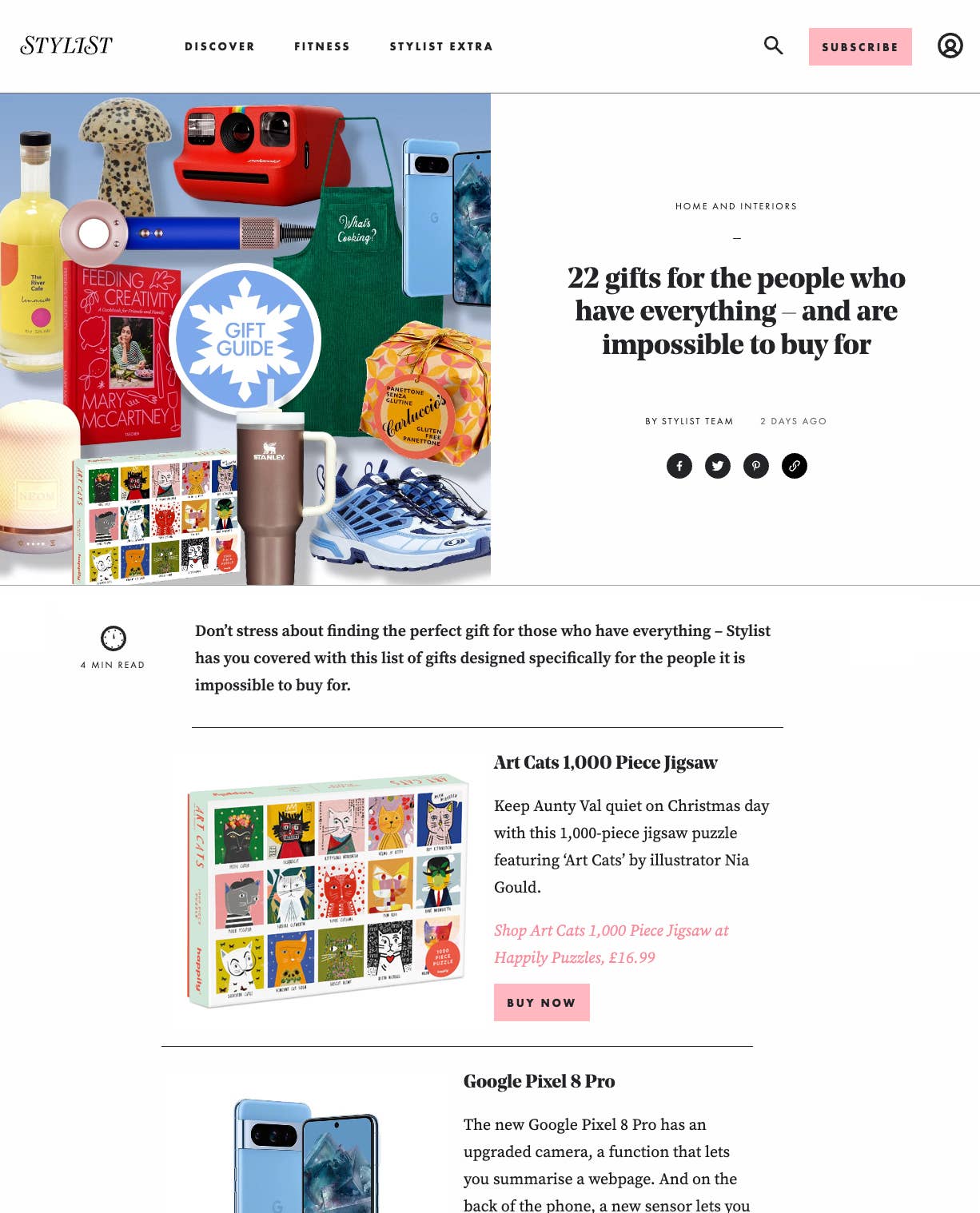 1,000 piece puzzle featuring illustrated ‘Art Cats’ by acclaimed illustrator Nia Gould. The perfect gift for cat lovers, and art lovers too!