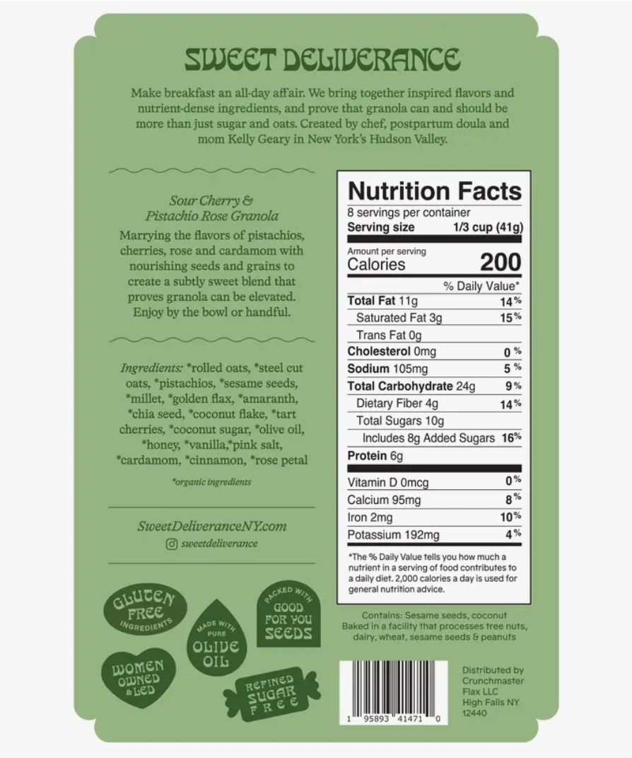 Ingredients (all organic): rolled oats, steel cut oats, pistachios, sesame seeds, millet, golden flax, amaranth, chia seed, coconut flake, tart cherries, coconut sugar, olive oil, honey, pink salt, cardamom, cinnamon, rose petal