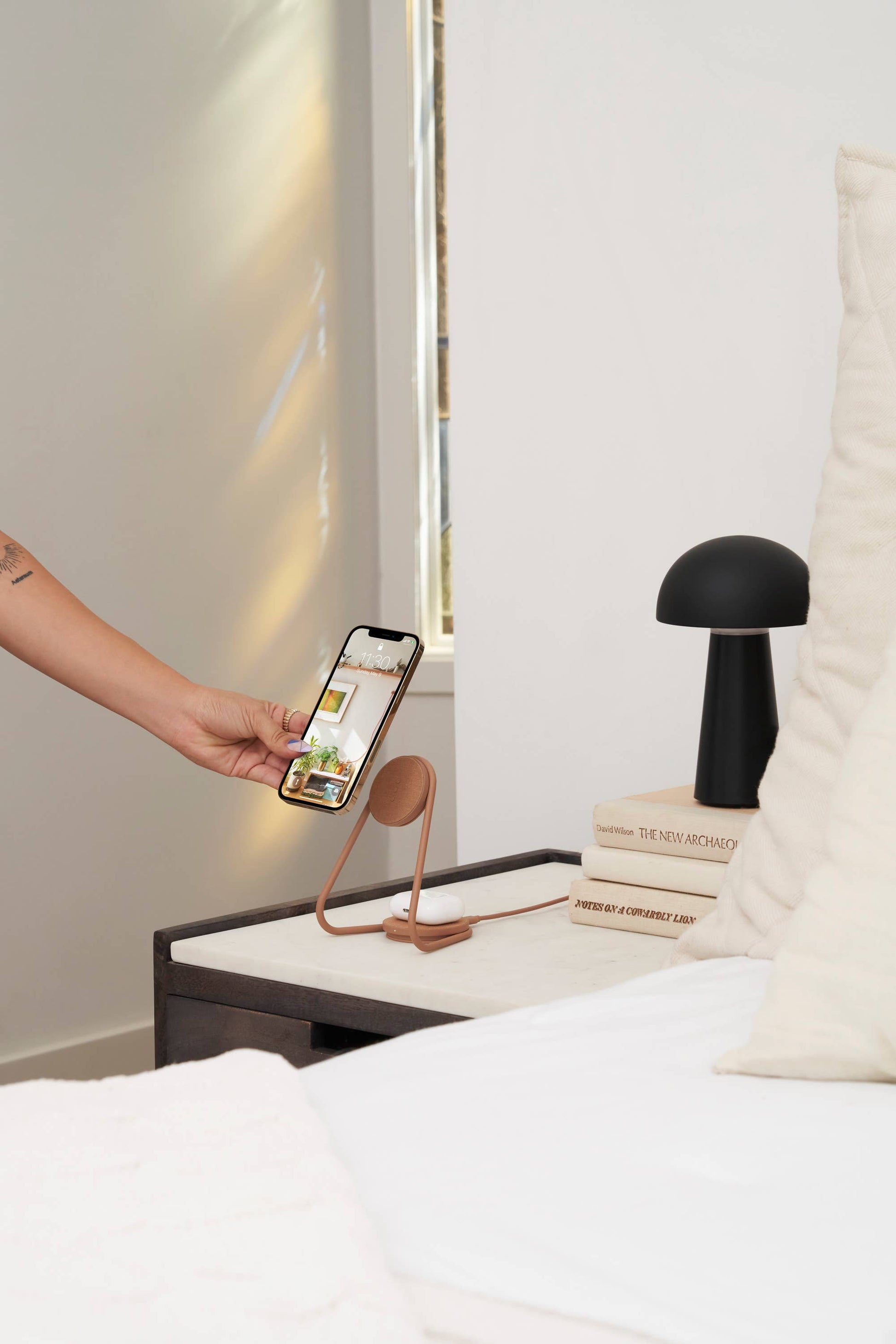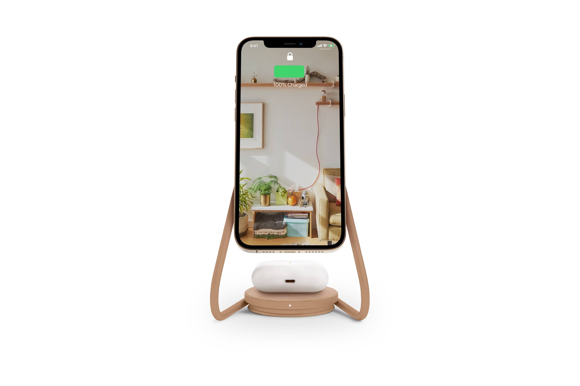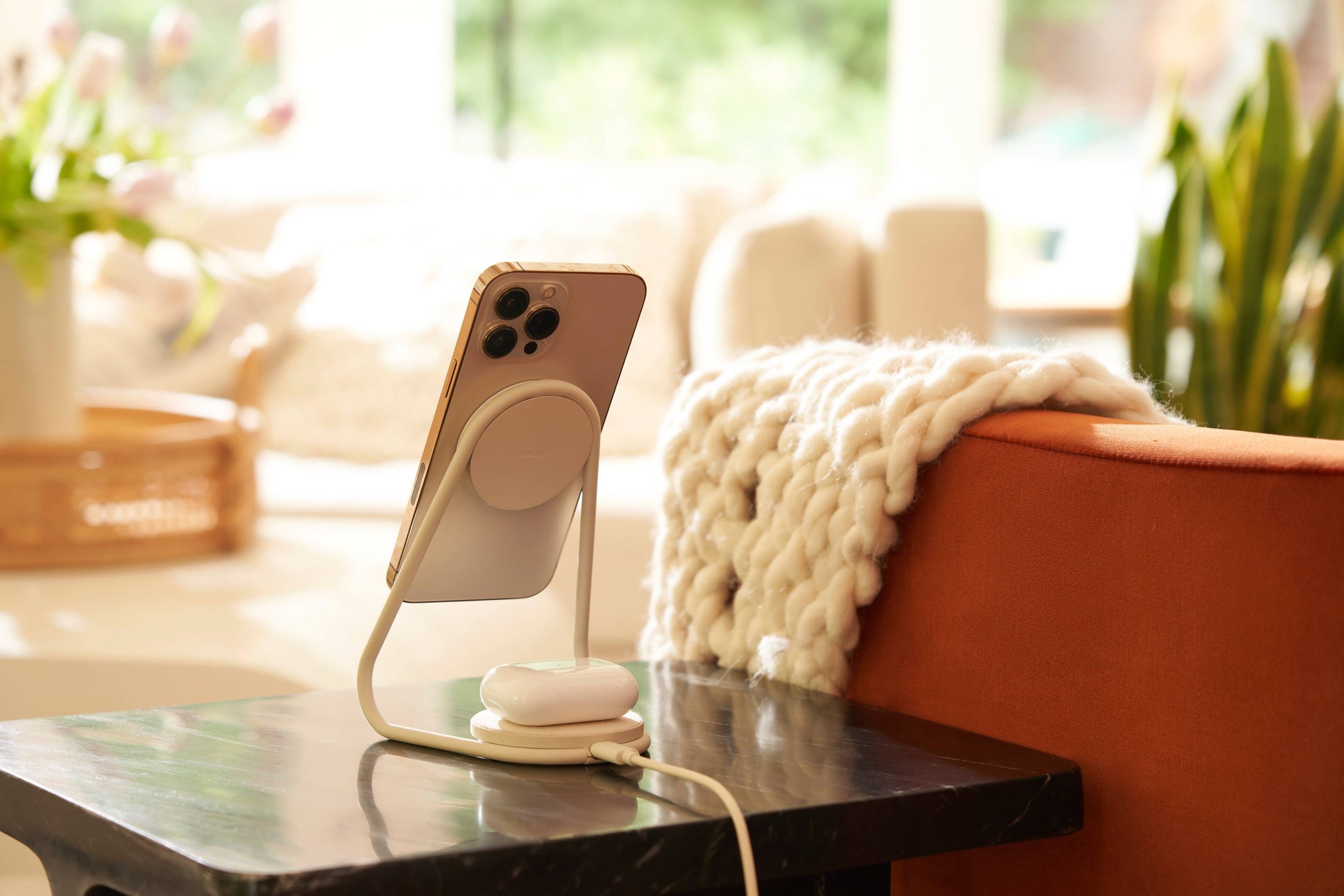 Multi-device Mag Safe Compatible wireless charging. The perfect accessory for an iPhone and AirPods user. Magnetically snap-on your iPhone 12/13/14 on the charging stand, and place your wireless charging AirPods on the base. This unique, sleek design, inspired by home decor, works best on your desk or bedside.