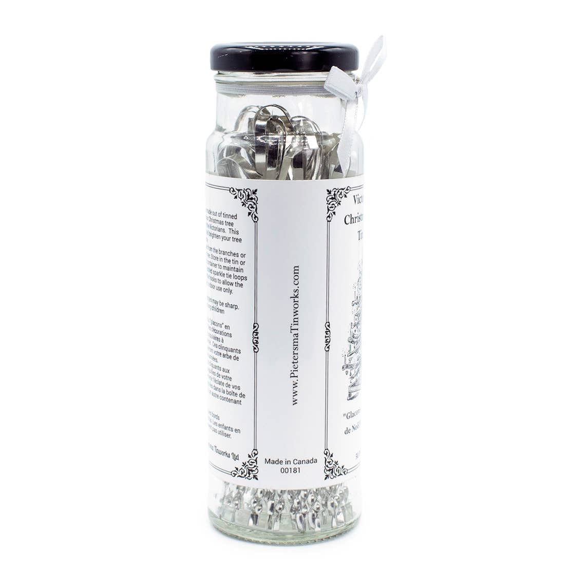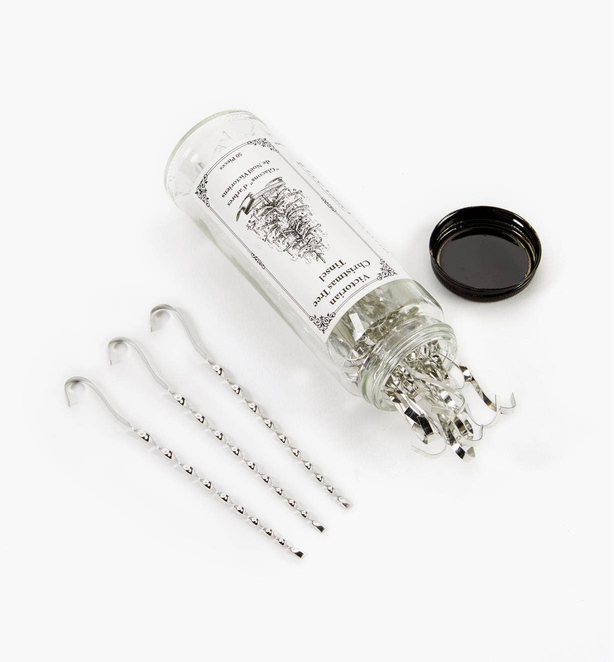 This timeless decoration adds a finishing touch to any tree. Each tube contains 50 pieces of five-and-a-half-inch long Victorian-style tinsel. We craft the tinsel from USA-made tin-plated steel at our small shop in Lancaster, Ontario, Canada. It created a stiff, icicle-like ornament that catches the light.